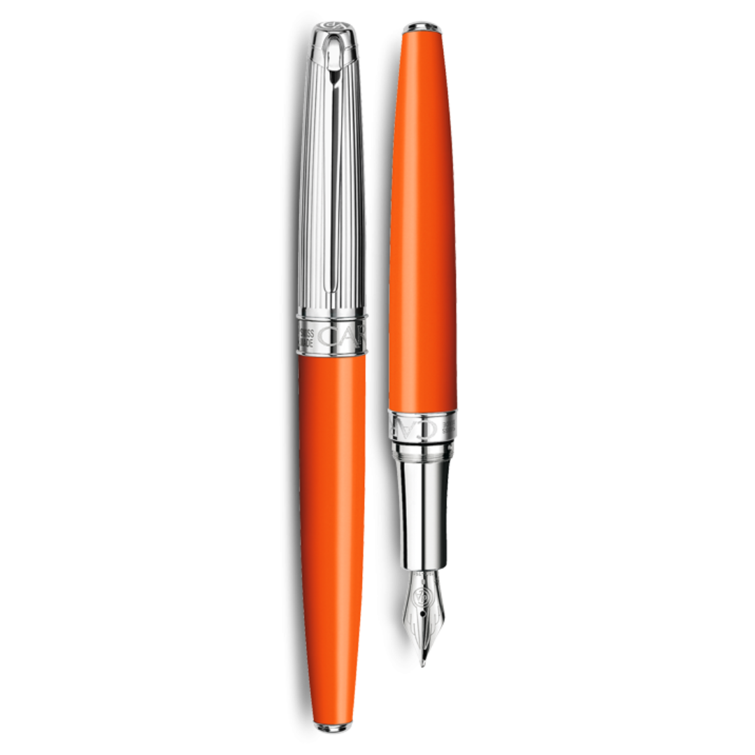 Reservoar med 18k guldspets i mediumbredd (M), orange lack och rhodiumpläterad huv .