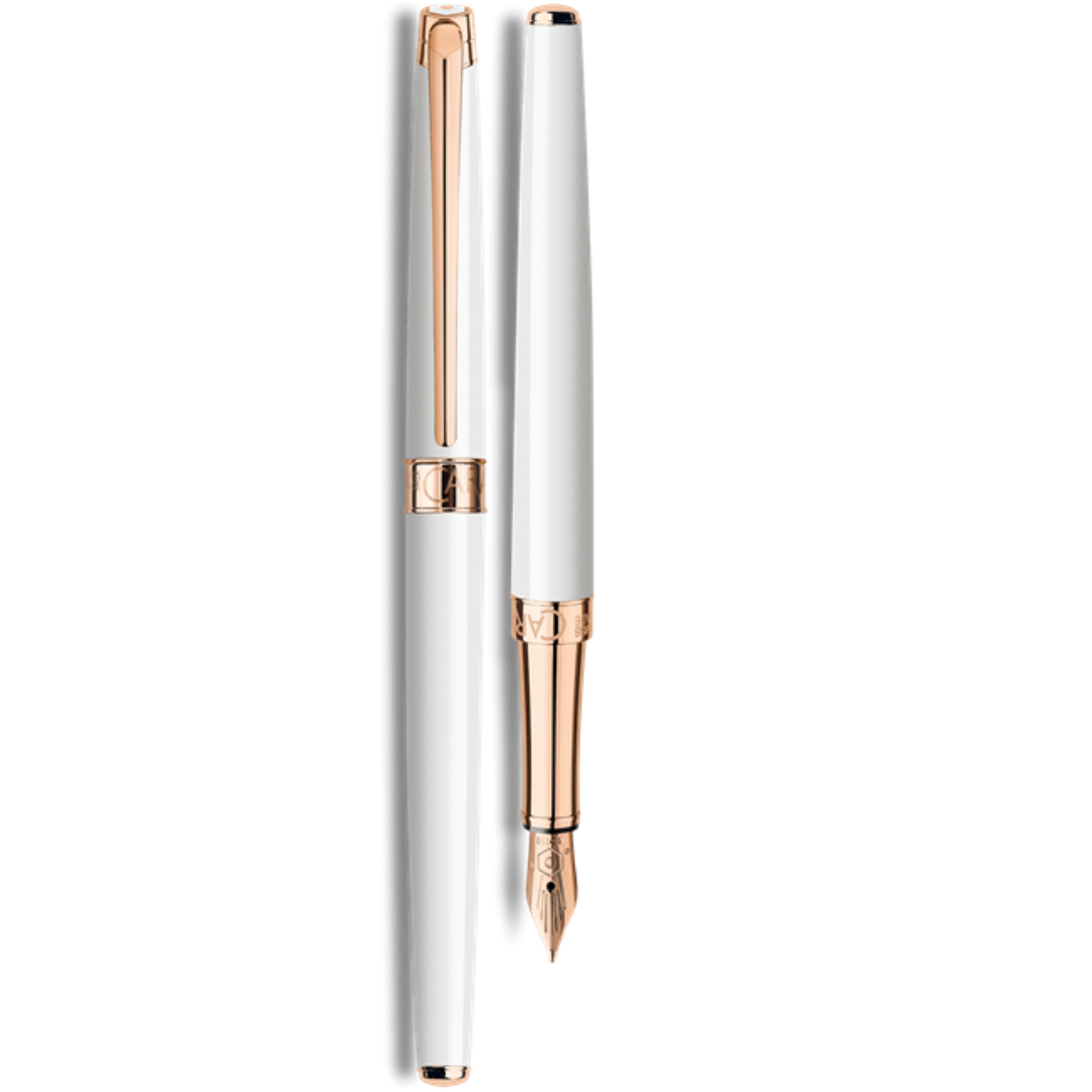 Reservoar med 18k guldspets i mediumbredd (M), vit lack och roséguldpläterade detaljer. Konverter eller patroner, annan spets kan fås mot förfrågan.