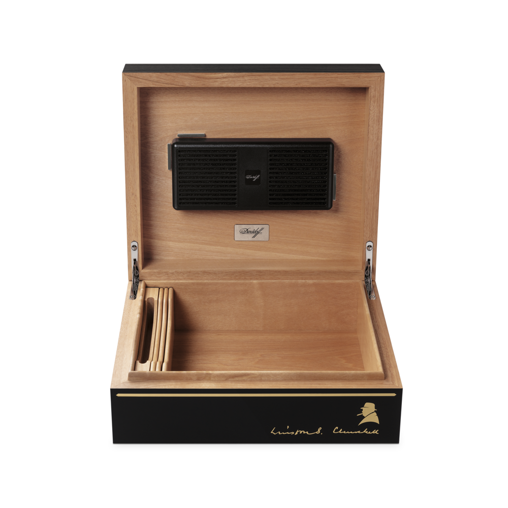 Humidoren är en hyllning till Churchills konstnärliga sida, där locket pryds av hand ikoniska silhuett i livfulla färger som påminner om penseldrag.