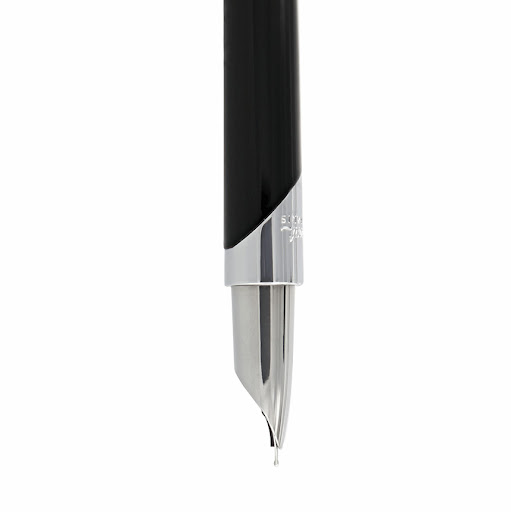 Reservoarpenna i svart lack med vit-metalldetaljer.